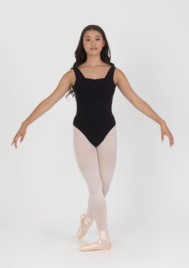 A perfect leotard for ballet class or to use as a base for a performance. Featuring a gathered front with mesh panel overlays, and mesh panel v-shaped open back.